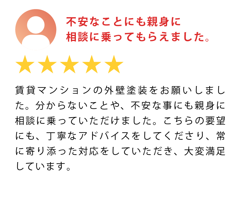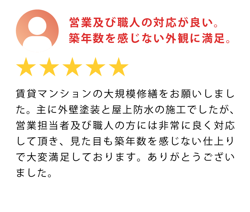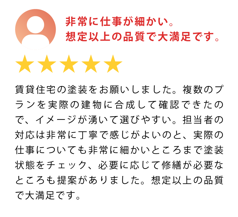 不動産賃貸業において10年に一度の大仕事が大規模修繕。たくさん相見積もりを取った中で、特にフィーリングが合ったアローペイントさんを選んで長い間”特命塗装業者さん”としてお付き合いをしています。この10年、他の業者さんを使ったことはありません。もちろん値段はありますが、品質と実績も見ています。仮に安くても品質が悪ければ2度と依頼することはありません。物件の品質維持こそ不動産賃貸業の柱となるので、この3つが譲れないポイントです。
